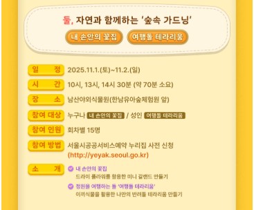 - 둘레길 그림여행: 한남유아숲체험원에서 서울 공원 드로잉 북 채색, 11월 1~2일 운영, 회당 20명 참여 가능.