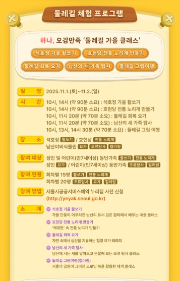 - 둘레길 회복 요가: 자연 속에서 심신 치유, 회당 성인 20명, 11월 2일 10시, 11시.