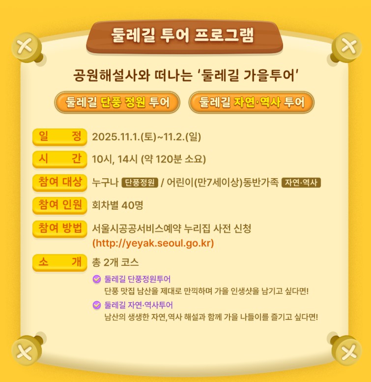 - 둘레길 단풍 투어: 남산둘레길 북측순환로를 공원 해설사와 함께 걸으며 단풍을 감상할 수 있습니다. 11월 1~2일 10시, 14시 회당 40인 참여 가능.