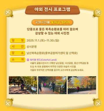 남산 북측순환로 산책로에는 서울 공원 사진사가 기록한 남산공원, 낙산공원, 용산가족공원의 순간을 담은 사진전 ‘컬러풀 랜드’가 11월 한 달간 상시 전시됩니다. 산책과 함께 가을 풍경을 사진으로 감상할 수 있어 특별한 경험을 제공합니다.