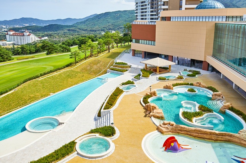 온천 전문 리조트로 ‘물놀이 + 피부온천’ 조합이 탁월.